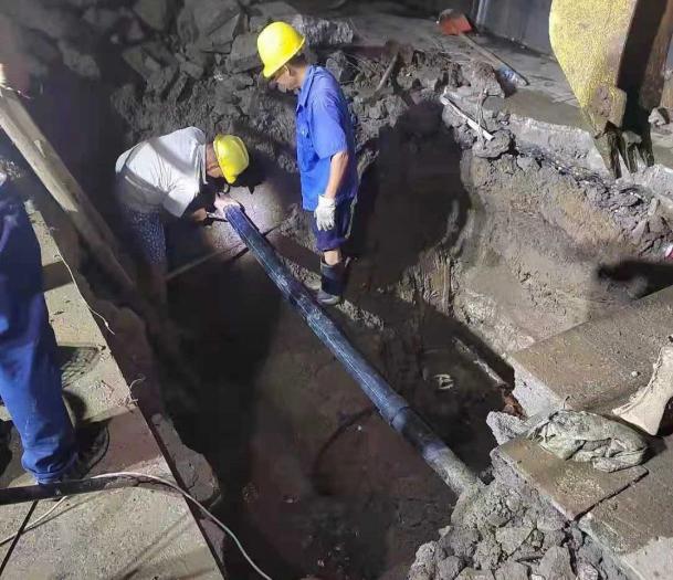 DN600管徑是襄城輸配水主管線,炎熱夏季正值用水高峰,閘門一旦關(guān)停就會造成大面積用戶停水。由于該地段有3個不同高度的地平面,而漏點又在停車場內(nèi),地形錯綜復(fù)雜不利于大型設(shè)備開挖??阂嘬姷葲]有等待,與商都負(fù)責(zé)人郭洪取得聯(lián)系一起協(xié)調(diào)車輛疏散,核實最佳地點開挖面積長15*2米,于晚22:15用水峰值下來后立即停水維修D(zhuǎn)N600開口夾板,于15日0:15分完成搶修開水,2:00完成回填維修完畢。