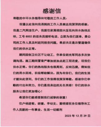 近日,襄陽中環(huán)水務(wù)有限公司樊城管網(wǎng)分公司收到一封熱情洋溢的感謝信,信中表達(dá)著對樊城管網(wǎng)分公司工作人員主動作為、及時解決用戶用水難題的感謝、贊揚(yáng)和認(rèn)可。
